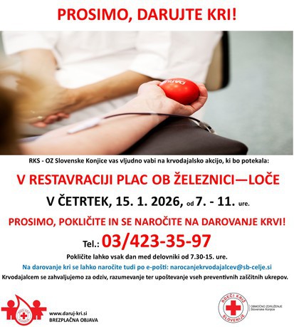 Območno združenje Rdečega križa Slovenske Konjice in Krajevna organizacija Loče vabita vse zdrave občane in okolice, na krvodajalsko akcijo.